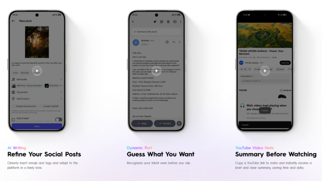 AI has been a major focus in HiOS 16, now featuring a more powerful built-in βEllaβ assistant with deeper system integration and better context understanding. It can help you manage daily routines, offer proactive suggestions, summarize YouTube videos, and integrate with WhatsApp to read and reply to messages.