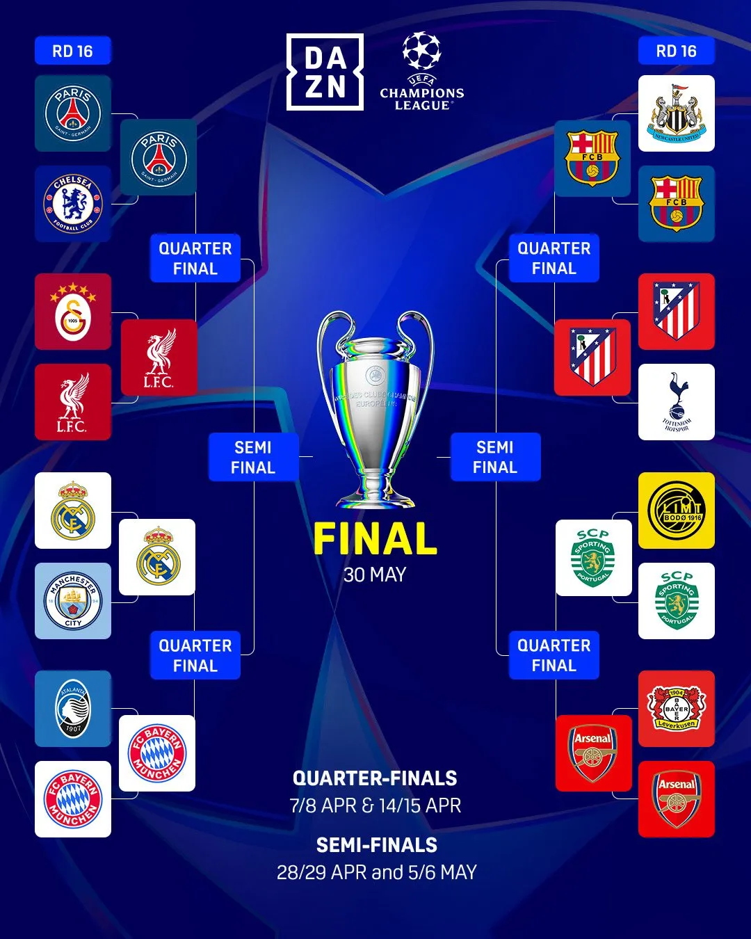 When the Round of 16 draw was made, UEFA also mapped out the full path each side would need to follow to reach the Champions League final at the Puskás Aréna in Budapest, Hungary. The quarterfinal matchups are as follows:
