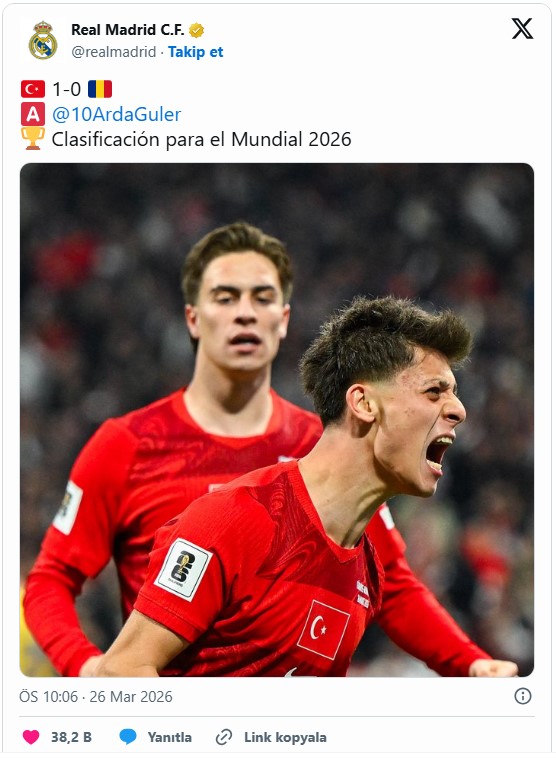 FIFA 2026 Dünya Kupası Elemeleri play-off yarı finalinde Romanya'yı konuk eden A Milli Futbol Takımımız, mücadeleyi 1-0 kazanarak adını finale yazdırdı. Bizim Çocuklar'a galibiyeti getiren golü dakika 53'te Arda Güler'in şık asisti ile Ferdi Kadıoğlu kaydetti. Mücadelenin ardından Real Madrid, resmi sosyal medya hesapları üzerinden maç sonucunu Arda Güler'in fotoğrafı ile servis etti.