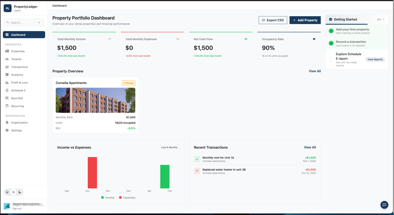 PropertyLedger helps small landlords manage rental property accounting with simple expense tracking, organized categories, and tax-ready Schedule E reports. You can log income and expenses, attach receipts, track depreciation, and export CSVs to streamline tax prep. Organize your portfolio across single-family, multi-family, condos, and commercial units. Manage tenants and leases, monitor ROI analytics, and get monthly summaries and renewal reminders without banking add-ons or upsells.