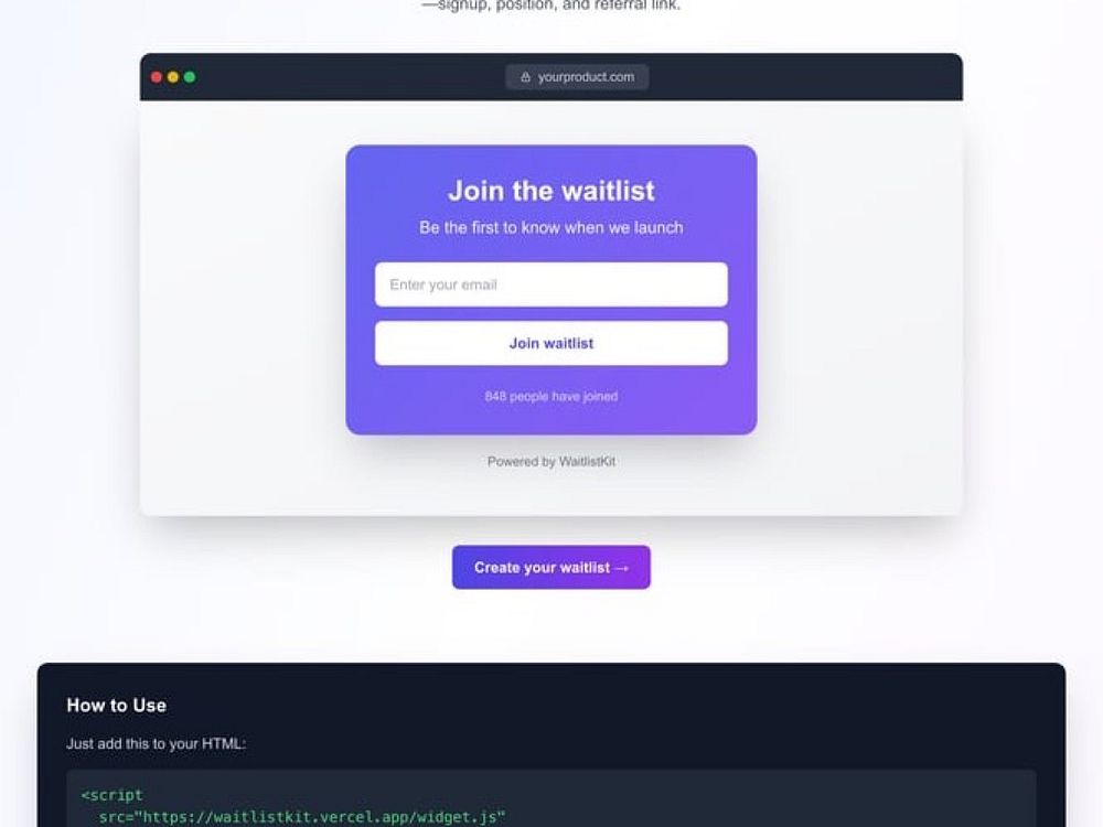 WaitlistKit lets you add a waitlist to your site with a single script tag and no backend. It captures emails with a clean widget and gives each user a unique referral link that moves them up the queue when friends join. Use the admin dashboard to see signups, visualize referral chains, and export CSVs to track your launch. You can start free with one waitlist and 100 signups, or upgrade for unlimited projects and viral growth features.