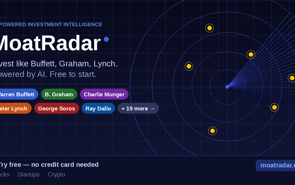 MoatRadar helps you find high-moat opportunities across stocks, startups, and crypto by applying the philosophies of Buffett, Graham, Damodaran, and 40+ others. It scans over 40,000 equities, 1,500 crowdfunding campaigns, and 50,000 tokens, then surfaces ideas in seconds. You can configure searches with valuation, growth, profitability, and risk filters, or pick an investor framework to see up to 20 opportunities per scan with concise breakdowns.