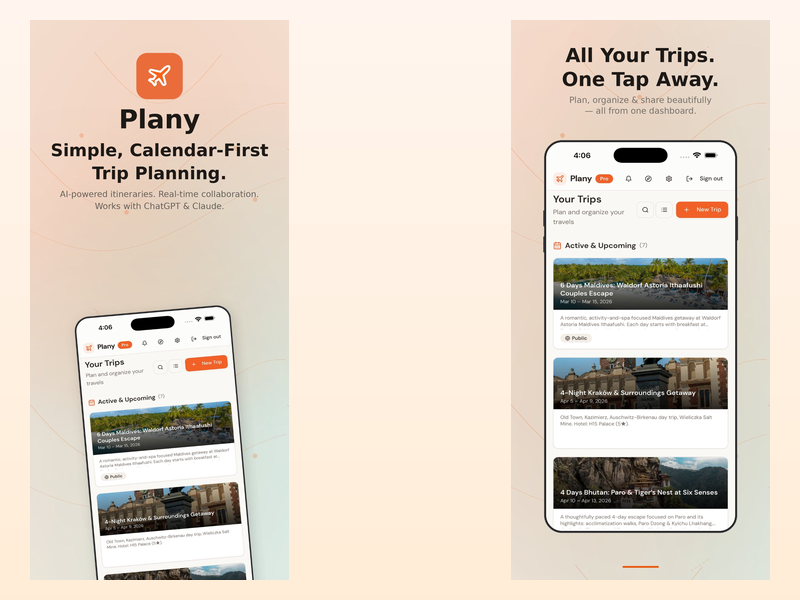 Plany organizes your trips on a visual calendar instead of a static list. Drag activities between days, see your whole itinerary at a glance, and collaborate with travel partners in real time. Connect ChatGPT or Claude, and your AI can create trips, add real places, and build day-by-day itineraries directly in your calendar. Import your Google Maps saved places with one click. Trips auto-segment by city when you visit multiple destinations. Share publicly or keep private. Free to start.