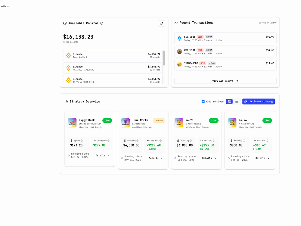 TwoTicks is a non-custodial crypto trading platform that lets you run automated trading strategies directly from your exchange account. Instead of manually watching charts all day, you can choose a strategy, connect your exchange, and let it run automatically. TwoTicks was built by experienced traders to give investors a more structured way to participate in crypto markets. You stay in full control of your funds while the platform handles the execution, automation, and tracking of results through a simple dashboard.