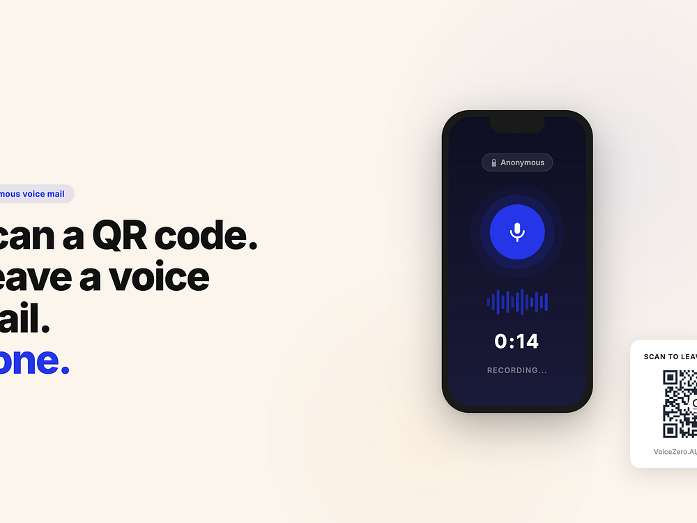 Text surveys miss 93% of human meaning. VoiceZero is an anonymous voice mail platform for HR, restaurants, and product teams. Users scan a QR code or use WhatsApp to speak freely. Our AI decodes the raw audio for tone, sentiment, and urgency across 74 languages. Standout features include zero-knowledge architecture (AES-256 and Tor) for total privacy, under 2-minute smart escalation to intercept issues, and AI theme clustering.