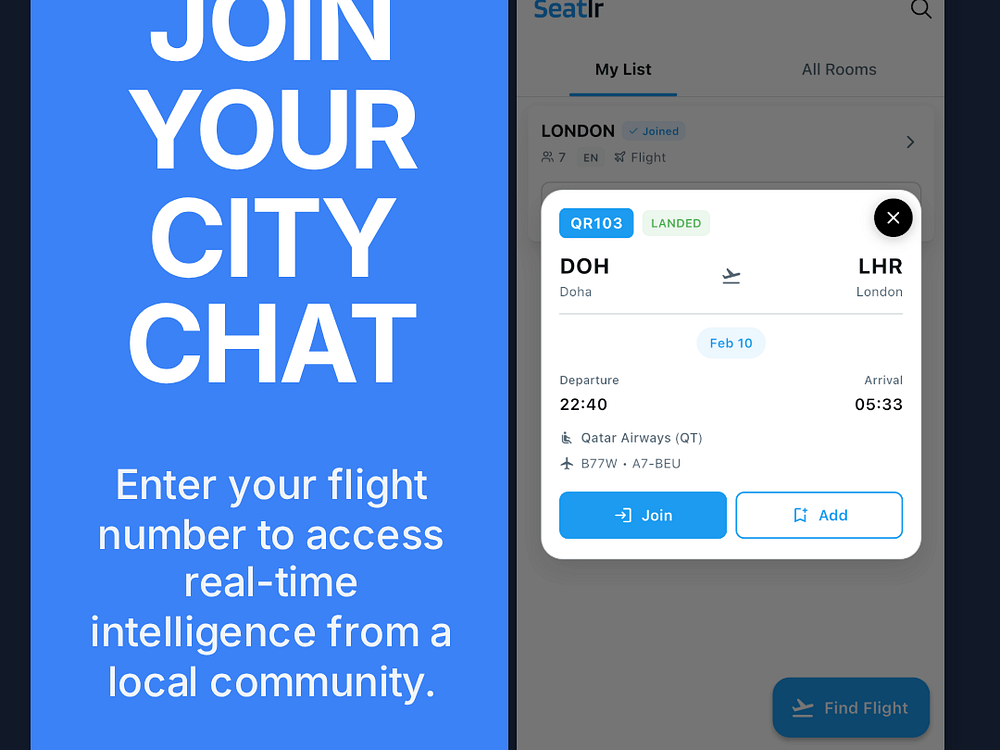 Seatlr – Enter your flight and join your city chat room