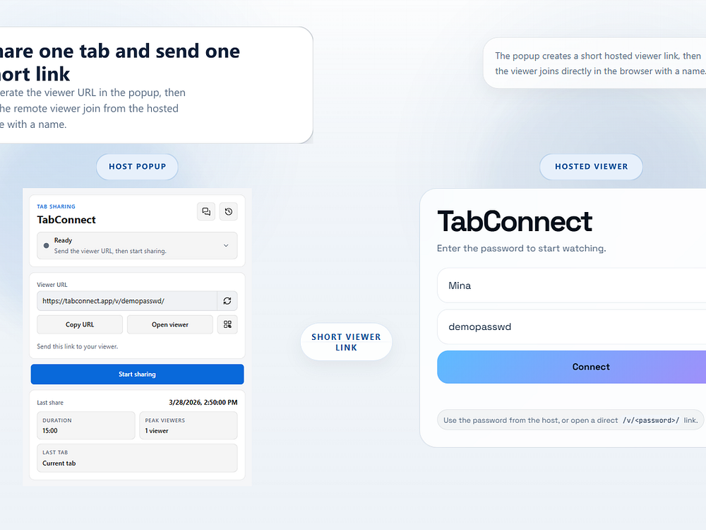 TabConnect is a free browser extension that lets you share your current browser tab using a secure link or short code, without requiring viewers to install anything. Instead of sharing your entire screen, you focus on a single tab. Start sharing from the extension, send the link, and let others join instantly in a clean hosted viewer with live controls and chat. It's built for product demos, support, onboarding, and guided walkthroughs where simplicity matters. The current version runs peer-to-peer WebRTC with up to 5 viewers. An SFU-based setup is available for early testers who need more scale.