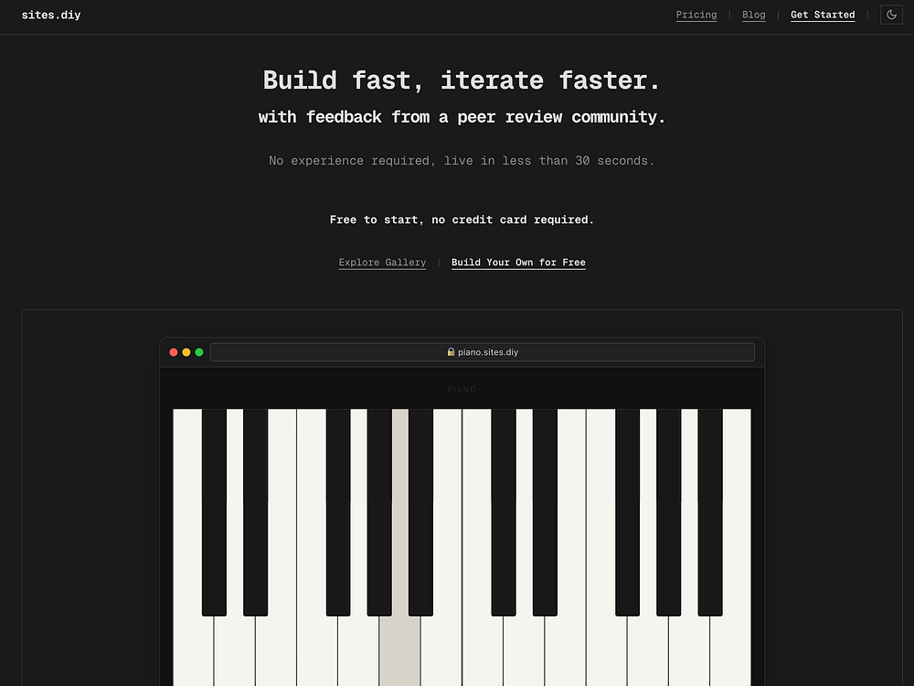 sites.diy is a website builder and hosting platform combined in one service. Our goal is to help you use AI to build products with a human touch. We're creating a peer-review community where people exchange feedback to improve their sites.