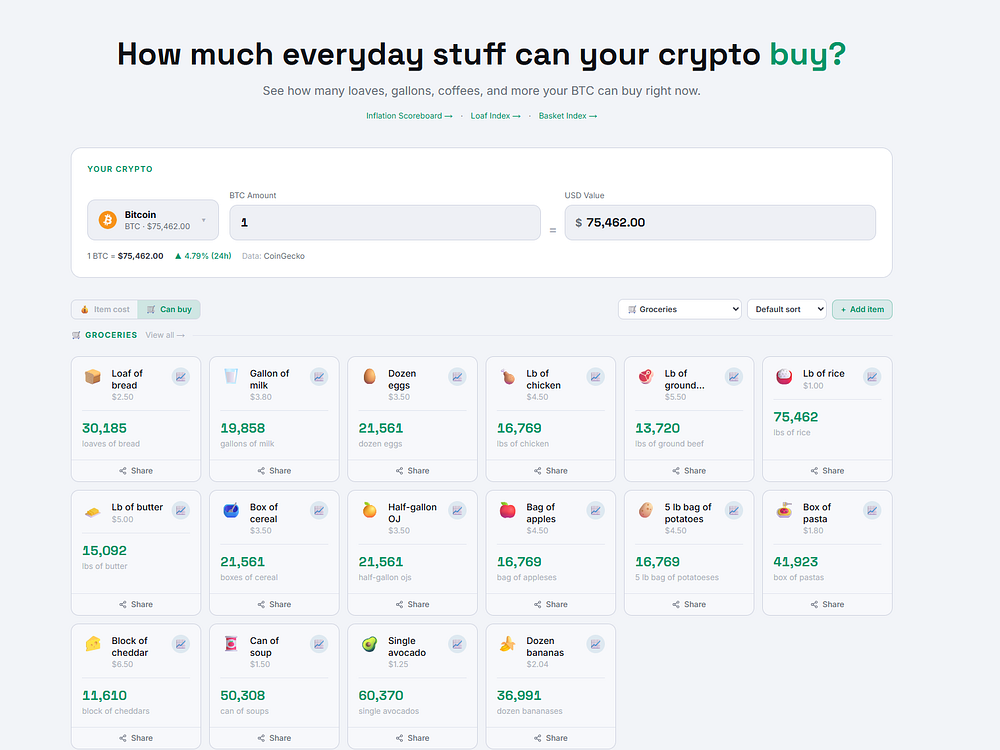 Free tool that converts any cryptocurrency into everyday items. Unlike typical converters that only show USD, CryptoStuffConverter shows what your Bitcoin, Ethereum, Dogecoin, and 50+ other cryptos actually buy in real items like bread, gas, cigarettes, rent, a Lamborghini, an ambulance ride, and 200+ more. It features a Crypto Basket Index tracking real purchasing power over time.