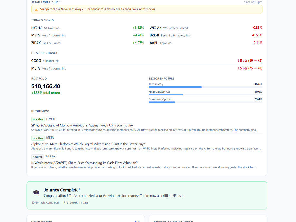 Financial Intelligence Service analyses ASX and US stocks in about 30 seconds, scoring each company across nine fundamental checks and presenting results in plain English. It includes AI-driven news sentiment, interactive price charts, analyst ratings, executive trades, and institutional holders to give you a clear, comprehensive picture of any company. Compare two stocks side by side, track a watchlist with live prices, and use a 0-100 score to cut through jargon and noise. FIS is currently in private beta.