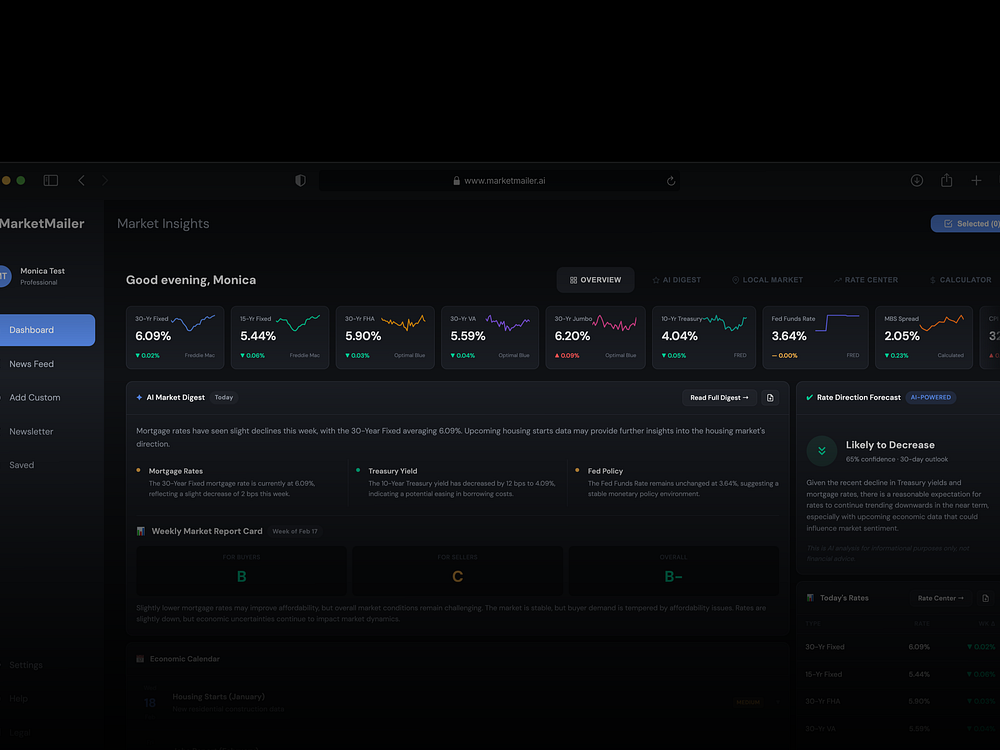 MarketMailer is an AI-powered email marketing platform that helps real estate agents and loan officers create polished, personalized newsletters in minutes. It pulls live mortgage rates, AI-written market digests, and local data, and curates top articles from sources like HousingWire, Inman, and CNBC. Users can control tone, depth, audience, and focus, so newsletters sound personal and professional. Import your own links, generate copy fast, and keep consistent outreach that wins referrals while saving hours every week.