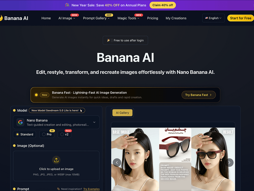 Banana AI is a free AI photo editor that lets you edit, restyle, and generate images with text prompts in 1–2 seconds. Powered by Google’s Nano Banana (Gemini 2.5 Flash Image), it removes objects, replaces backgrounds, adjusts lighting, and keeps subject identity for consistent results. Use curated styles and prompt templates, batch edit multiple photos, and create 3D figurines, avatars, or brand visuals without design skills. The simple interface and fast processing help creators, marketers, and everyday users turn ideas into polished visuals instantly.