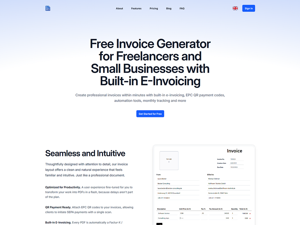 Every invoice is Factur-X and ZUGFeRD compliant by default, with no setup needed. Clients can pay instantly by scanning a SEPA QR code directly from the invoice. With e-invoicing mandates coming in France in 2026 and Germany in 2027, you're already covered from day one. No credit card needed, no transaction fees.