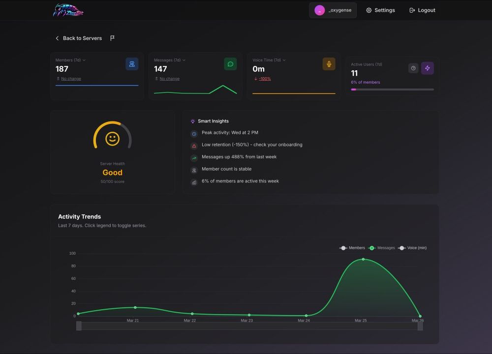 ZleeBit delivers deep analytics for Discord servers with multi-layer drill-downs that reveal who, what, when, and why behind every metric. Track member growth, invites, retention, message activity, voice usage, and moderation to understand how your community evolves.