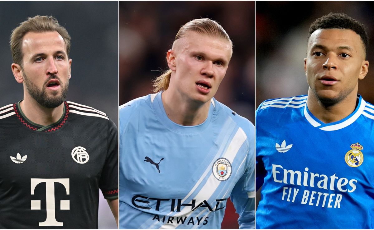 Harry Kane of FC Bayern Munich, Erling Haland of Manchester City, and Kylian Mbappe of Real Madrid.
