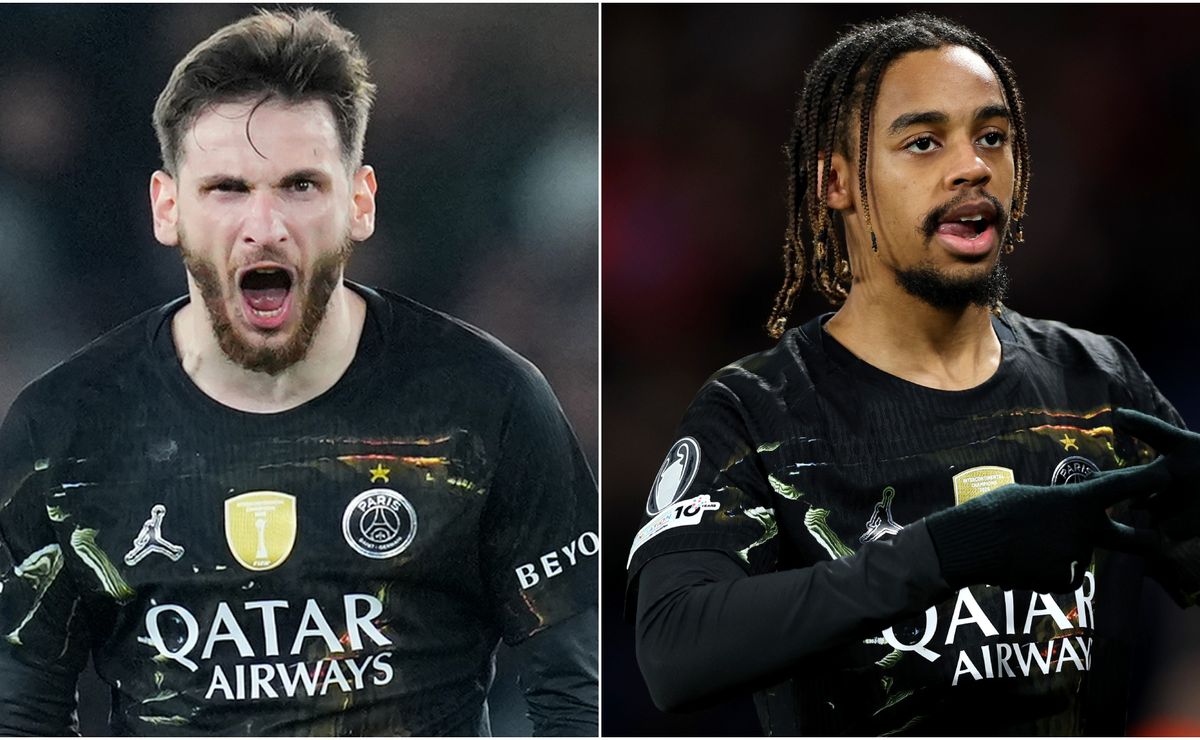 PSG star Khvicha Kvaratskhelia and Bradley Barcola celebrating a goal.