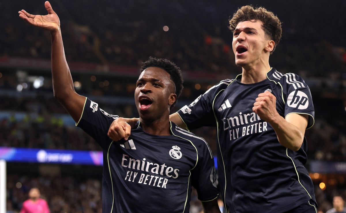 Vinicius Junior of Real Madrid celebrates scoring against Manchester City.