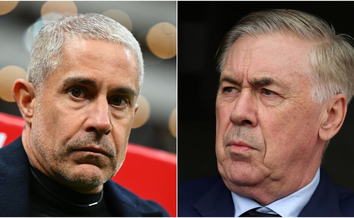 Albania coach Sylvinho and Brazil manager Carlo Ancelotti.
