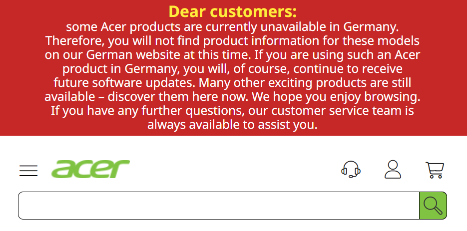 Because HEVC support is deeply integrated into current hardware and software stacks, the decision potentially covers most recent laptop and desktop models from both companies. Acer has already removed PCs from its German online store, leaving only accessories such as monitors available. ASUS has similarly restricted parts of its German website, with some product pages offline or marked as unavailable.