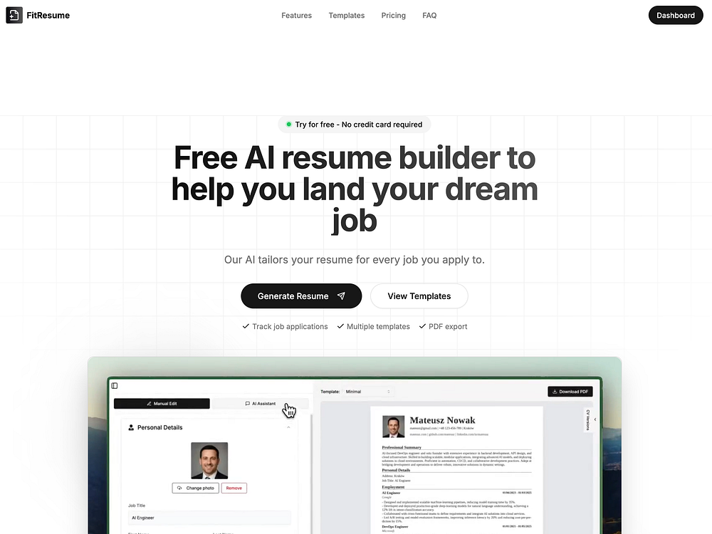 Fitresume.app is a free, AI‑driven resume builder that generates ATS‑friendly resumes, lets you choose polished templates, and custom‑tailors every resume to the exact wording of each job description. Ready to download as a PDF in seconds. Beyond writing, it tracks every application, follow‑up, and interview while visualizing your entire pipeline with an interactive Sankey diagram, so you stay organised and land offers faster.