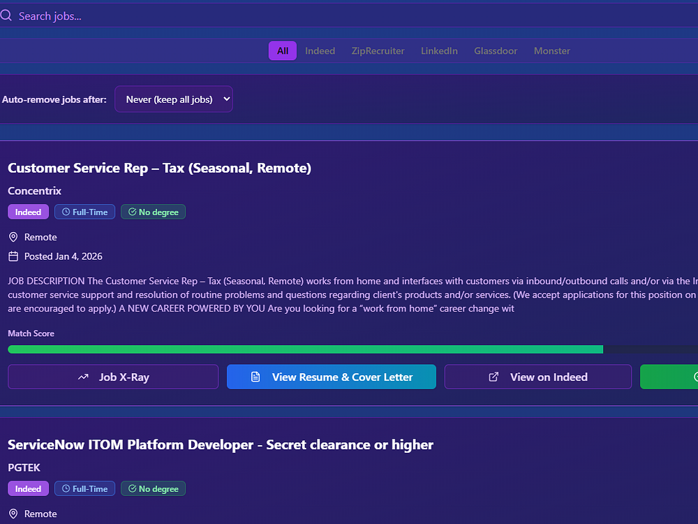 JobHustler automates your job search across LinkedIn, ZipRecruiter, Indeed, Glassdoor, and Monster without browser extensions or platform credentials. It scans listings, filters for quality matches with a 70% fit score, and helps you act faster. Use built-in AI to tailor resumes and generate cover letters for each application, and get started on a free tier that never stops.