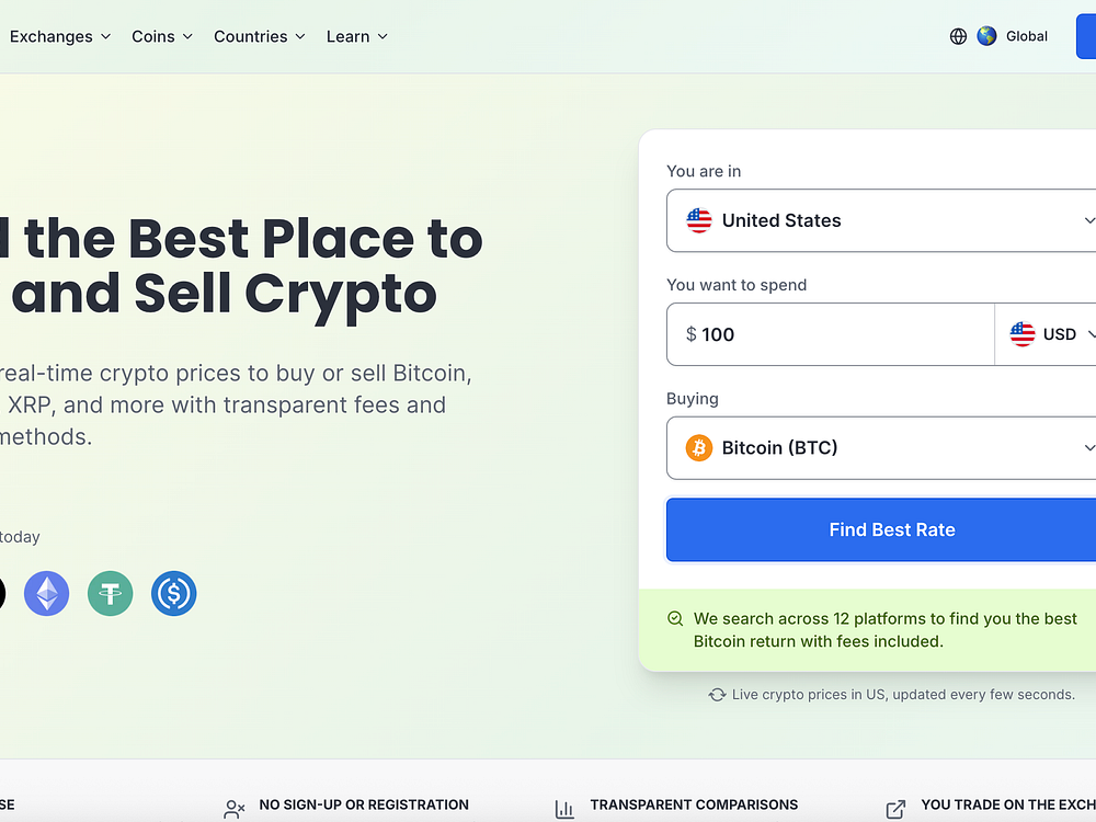 Coinvela helps you find the best place to buy and sell cryptocurrency by comparing real-time prices and total costs across 13 exchanges. It shows transparent fees and payment methods, updates quotes every few seconds, and supports popular coins like Bitcoin, Ethereum, XRP, USDT, and USDC. You can use it for free without signing up, and then complete your order directly with the provider you choose.