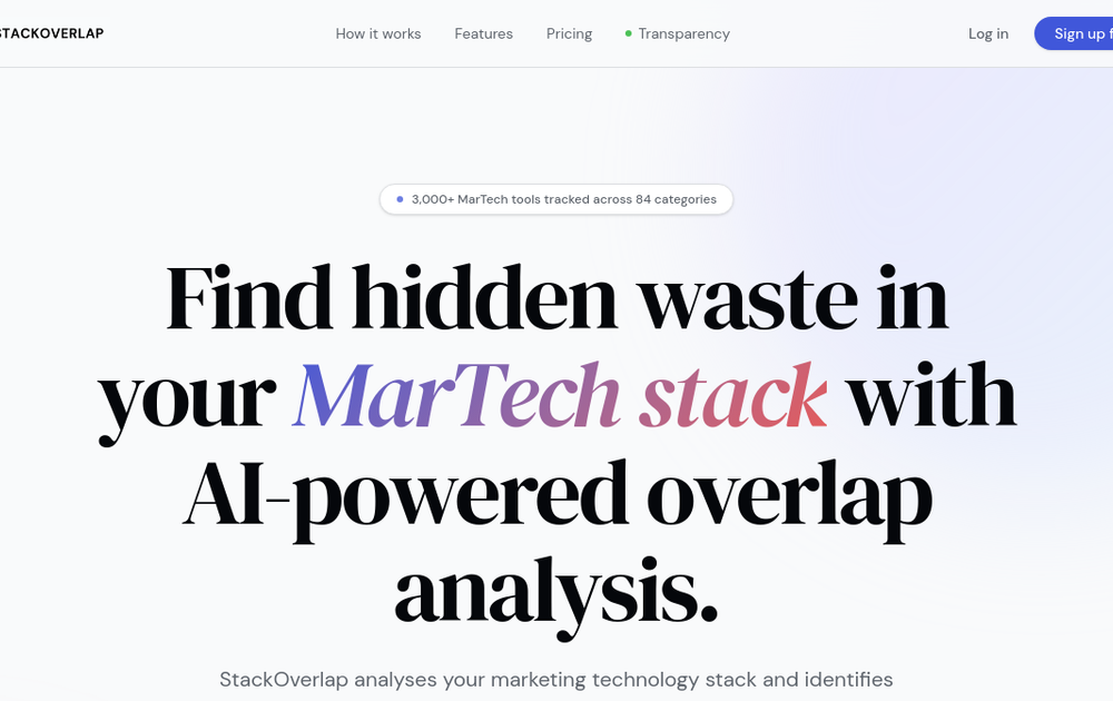 StackOverlap analyzes your marketing technology stack to uncover overlapping capabilities and quantify wasted spend. Its three-pass AI engine profiles each tool's architecture and delivery from a curated real-time database, detects genuine redundancies, uses your business context for unique insights, and self-critiques to improve accuracy.