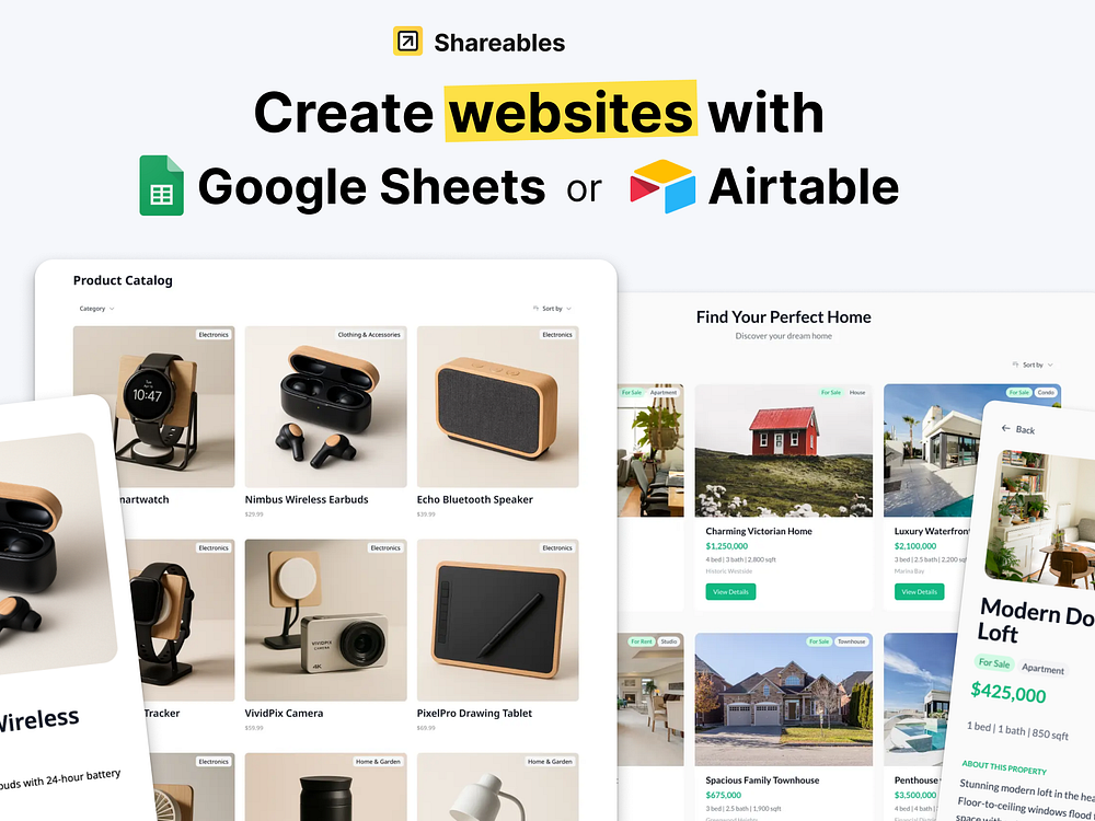 Shareables lets you turn data from Google Sheets, Airtable, Notion, Excel, and more into embeddable widgets or full microsites in minutes. Pick a template, map your columns, and customize search, filters, and design without code. Data syncs automatically, and you can embed on any site or publish to a custom domain with SSL.