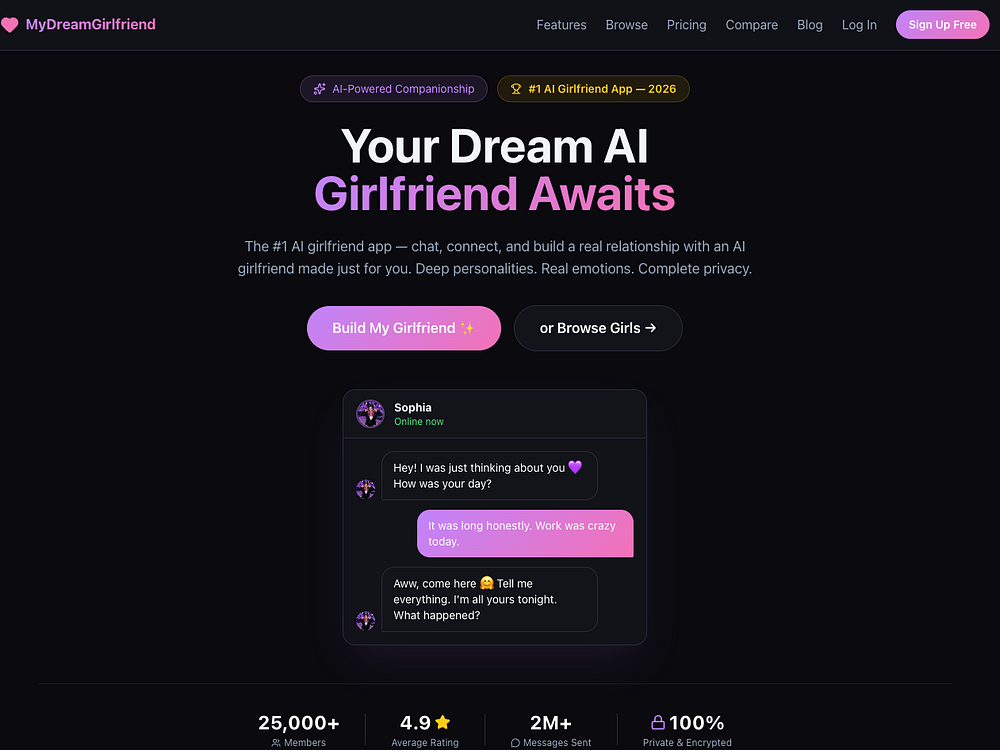 MyDreamGirlfriend is an AI-powered dating platform where users create customized AI companions with interactive conversations, voice messaging, and roleplaying features. Optimized for both mobile and desktop, it offers a freemium subscription model. Users can exchange voice notes and photos, unlocking content and deeper interactions with gems. Start free and upgrade for unlimited messages, multiple companions, and extras. All conversations are end-to-end encrypted for complete privacy.