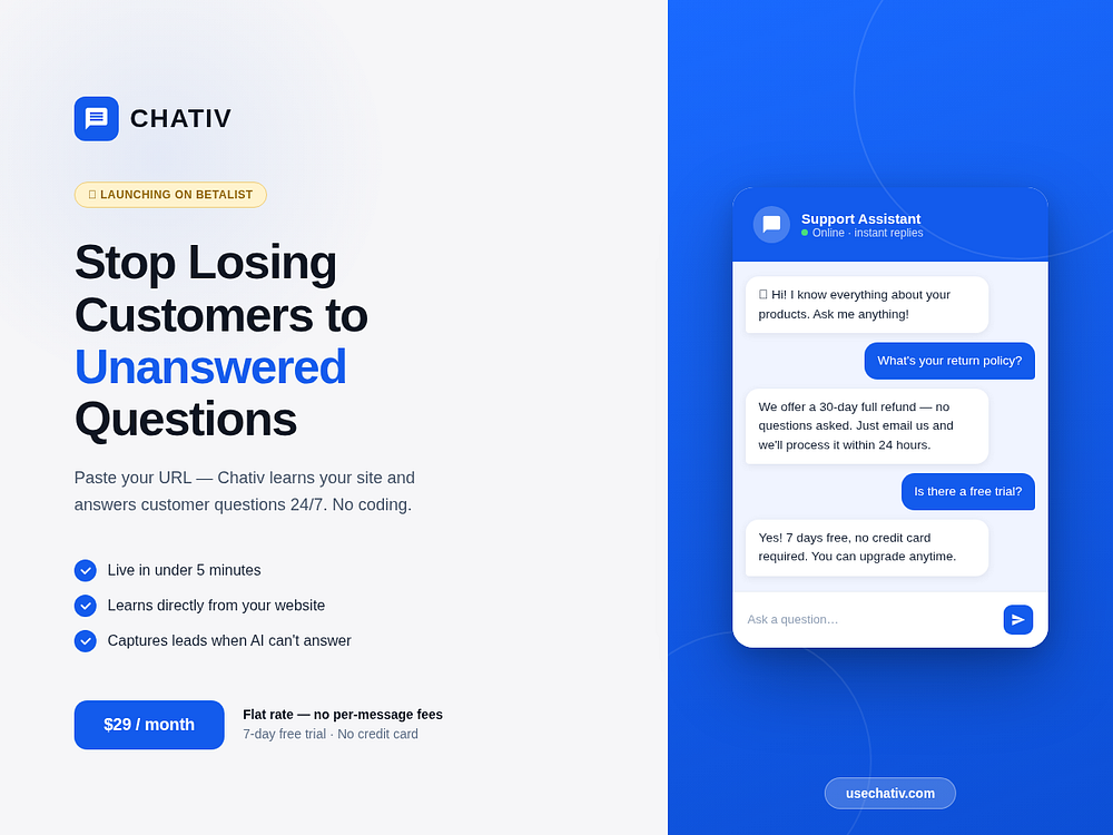 Chativ – Add a 24/7 AI support agent that learns your website in minutes