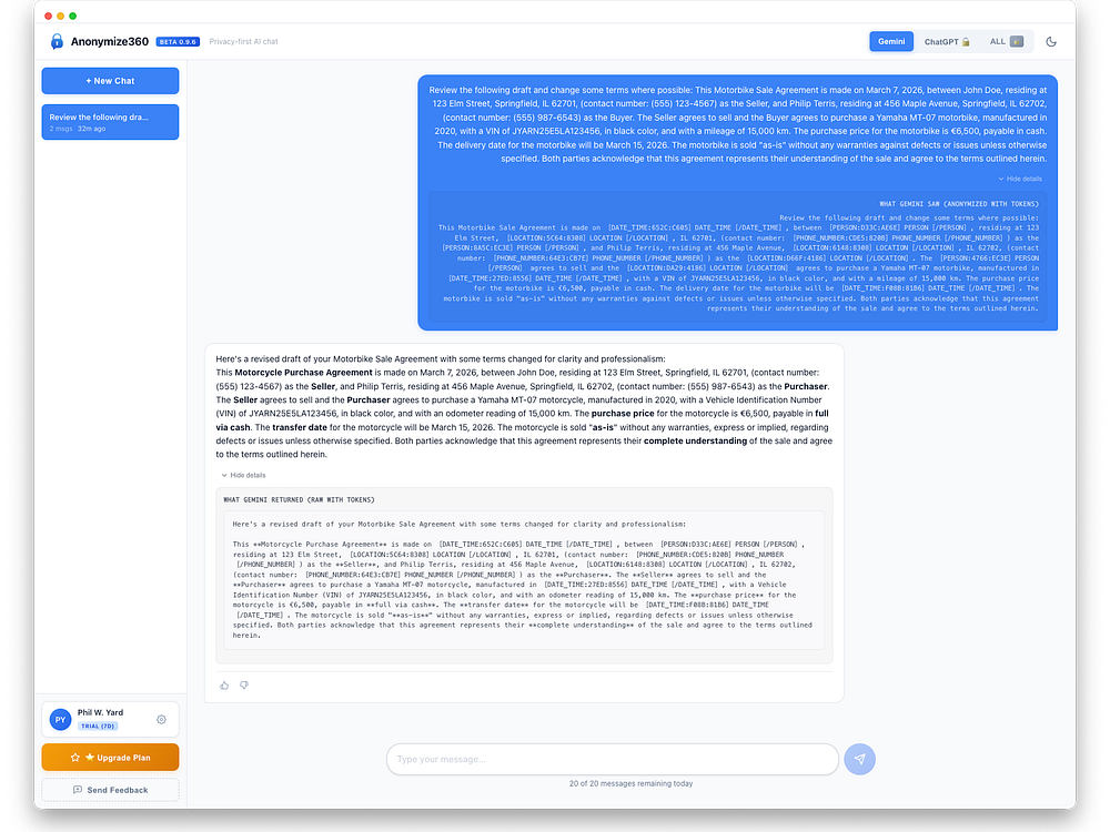 Anonymize360 protects sensitive data in AI chats by rewriting it on your device before it leaves and restoring it on return. It detects PII like names, addresses, SSNs, and medical or financial details, replaces them with tokens, and encrypts the originals locally with AES-256. The system runs on-device with a zero-knowledge design and works seamlessly with AI models. Enterprises gain privacy-by-default workflows and compliance support, while individuals can download and start with a free trial.