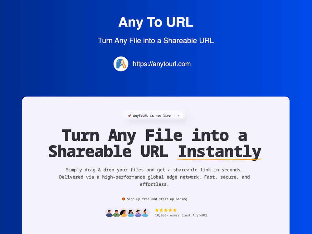 AnyToURL turns any file into a short, shareable link in seconds. Drag and drop to upload, then share an instant URL with browser previews for images, PDFs, and documents. Files are delivered over a global edge network for fast access worldwide. Add password protection, keep files temporary or make them permanent on paid plans, and manage uploads via API or CLI with custom domains and branding, supporting sizes up to 10GB.