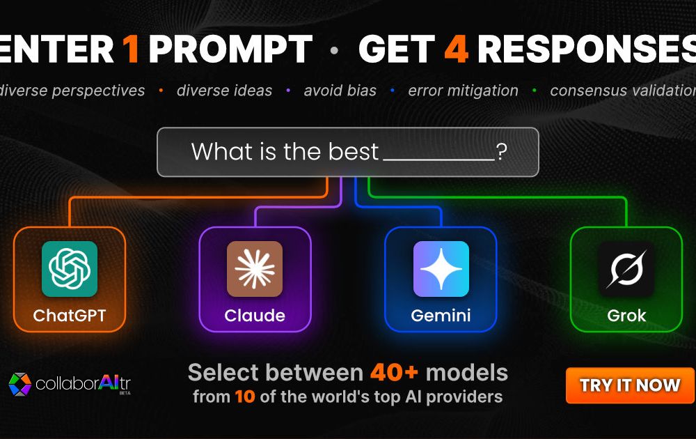 collaborAItr lets you run multiple AI models in parallel to plan, research, and execute tasks with a single prompt. View side-by-side responses, compare perspectives, and click Continue as your AI team learns from results and refines the plan. Connect to leading models like ChatGPT, Claude, Gemini, Grok, and 40+ others. Start free with no credit card, keep your data private, and use flexible tools to consolidate, fact check, and summarize responses.