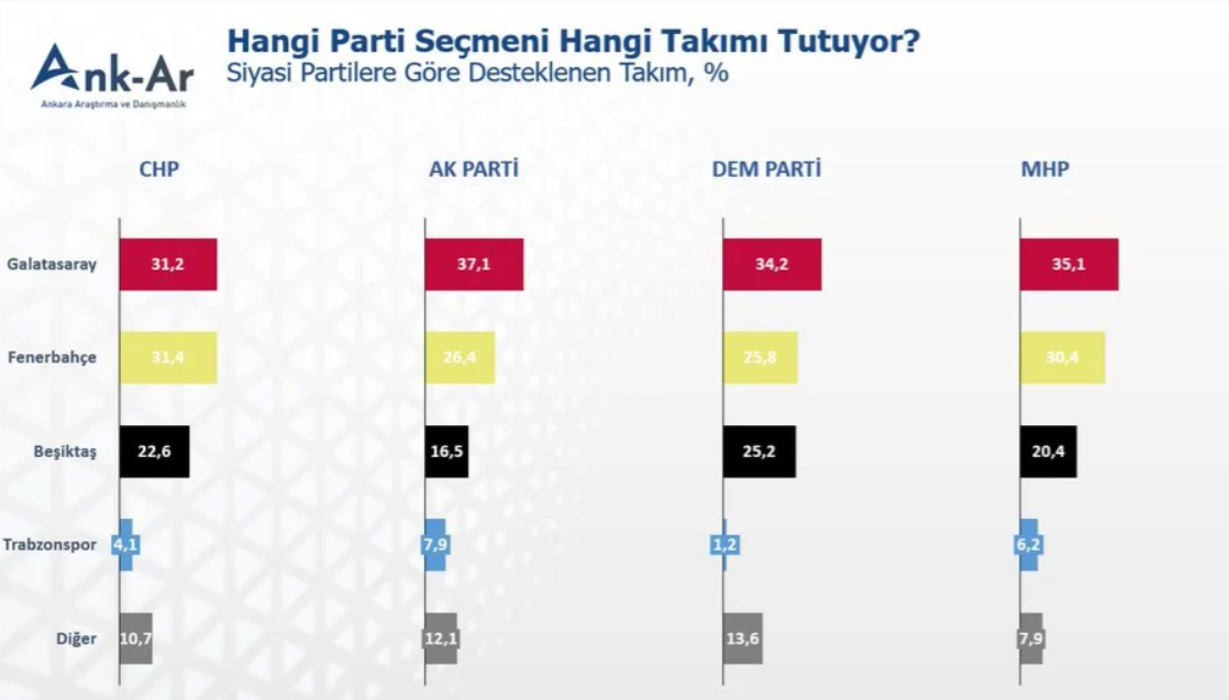 Türkiye erken seçim atmosferine doğru adım adım ilerlerken, araştırma şirketleri farklı alanlara yönelik çalışmalarını sürdürüyor. Bu kez siyasi tercihlerin futbol sevgisiyle ilişkisini inceleyen Ankara Araştırma ve Danışmanlık, “Hangi Parti Seçmeni Hangi Takımı Tutuyor?” başlıklı ilginç bir araştırma yaptı.