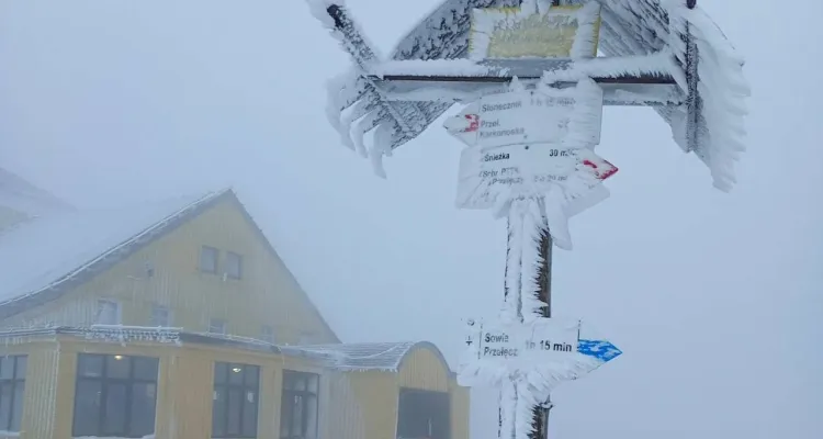 W górnych partiach Karkonoszy pada mokry śnieg, jest ślisko, temperatura odczuwalna dochodzi do minus 10 stopni Celsjusza. Widoczność z powodu mgły jest niewielka. Tworzą się zaspy. Ratownicy odradzają wędrówki.