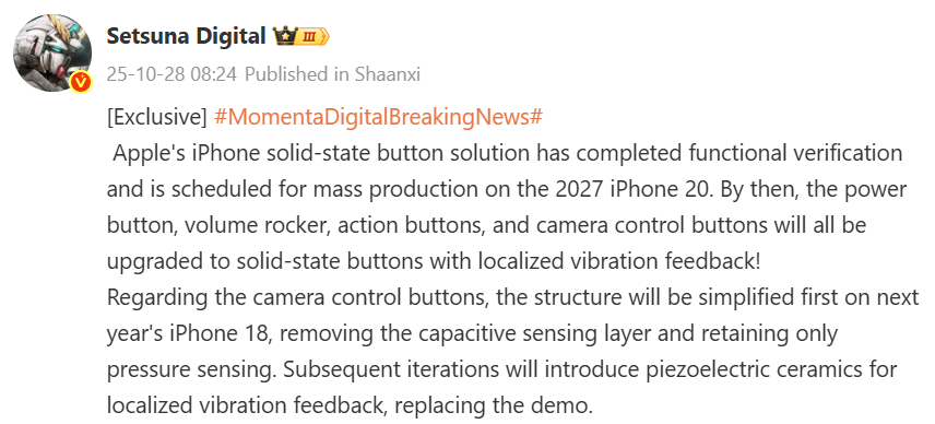 According to the source, by the time the iPhone 20 debuts in 2027, Apple intends to mass-produce solid-state buttons for the power key, volume controls, operational buttons and camera control buttons. Rather than moving parts, these buttons would rely on pressure sensing and “local vibration” feedback to give a button-like feel.