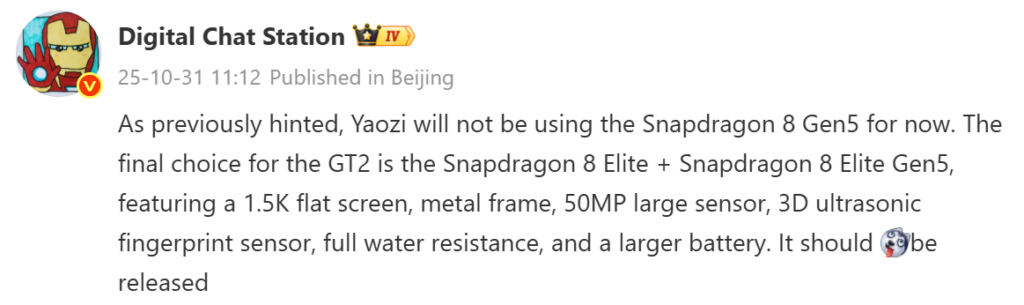 According to tipster Digital Chat Station, the Honor GT 2 and GT 2 Pro will be powered by the Snapdragon 8 Elite and 8 Elite Gen 5 chipsets, respectively. With this, he has debunked previous claims that the GT 2 would feature the upcoming Snapdragon 8 Gen 5 SoC.