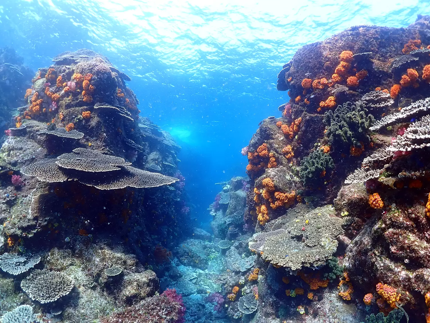 Fish gather in ridge-like areas along with the coral colonies. Fish that eat coral or use it as a hiding place gather around, along with predatory fish, creating a rich ecosystem. This scenery stretches for over 2.5 km on Yokoshima Island, which is a national park.