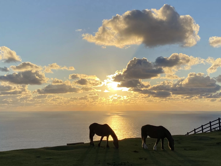 When it comes to sightseeing in Nishinoshima, Matengai Cliff at Kuniga Coast is a must-visit. Green grass, grazing cows and horses, and the sparkling blue sea beyond the cliff combine for a breathtaking view that changes subtly with each season.