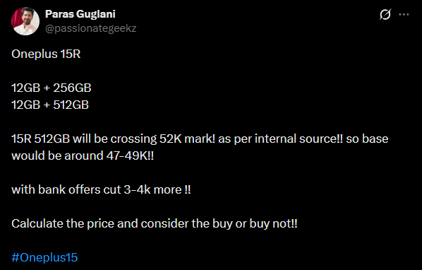 According to information shared by X tipster @passionategeekz, the OnePlus 15R will be sold in two storage variants in India. Both models will come with 12GB RAM. Buyers can choose between 256GB and 512GB internal storage options. The tipster claims that the 12GB and 512GB variant could be priced above Rs 52,000 based on an internal source. This places the base 12GB and 256GB model in the Rs 47,000 to Rs 49,000 range.