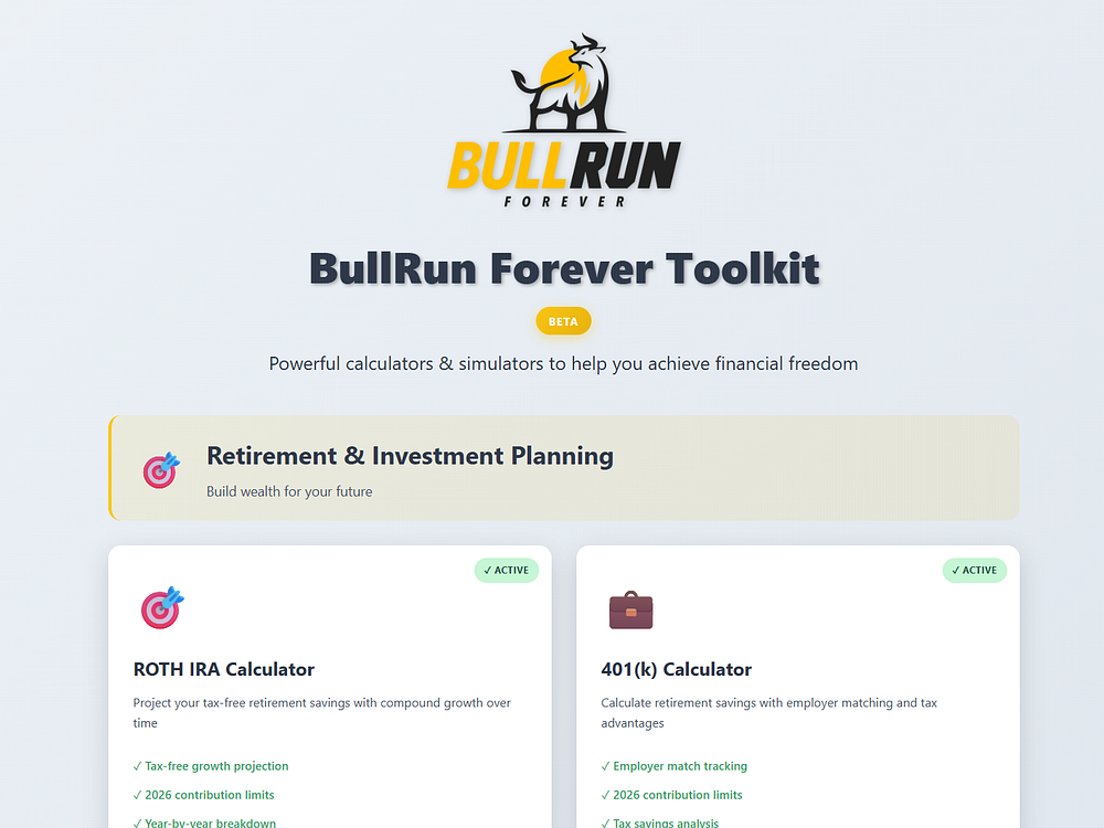 BullRun Forever Toolkit provides free, privacy-first financial calculators and simulators to plan debt payoff, budgets, investments, retirement, real estate, credit, and auto financing. Use tools like ROTH IRA and 401(k) calculators, investment and net worth projections, home affordability, student loan analysis, and debt strategy planners to model scenarios with penny-verified math. The toolkit works on any device, has no ads or sign-ups, and runs most calculations locally to protect your data.