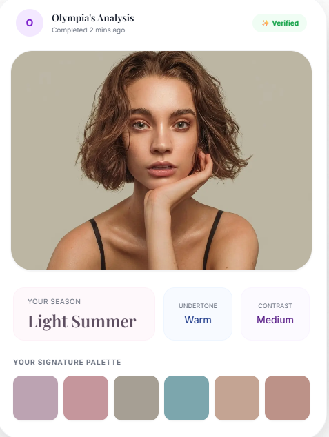 AI Color Analysis helps you discover your most flattering colors through a quick, photo-based assessment. Upload a clear photo, and our tool evaluates your undertone, hair, eyes, and facial contrast to deliver a personalized palette, along with guidance for outfits, makeup, jewelry, and hair. You can preview looks with virtual makeup, hair color simulations, and outfit draping, and keep lifetime access to your results for a one-time price.