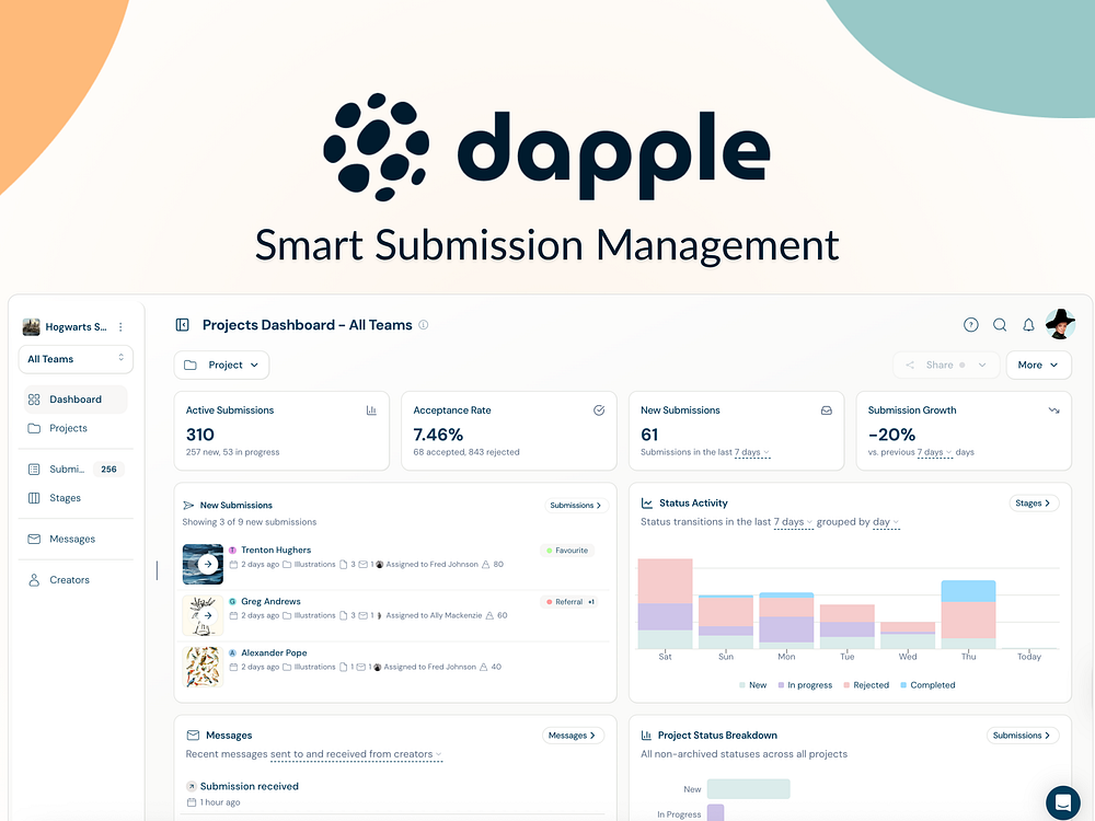Dapple helps creative organizations collect, review, manage, and report on submissions. Whether you're running awards, open calls, contests, or program applications, Dapple consolidates everything into an intuitive, all-in-one platform. Say goodbye to spreadsheets and clogged email inboxes; with Dapple, you have a single, easy-to-use tool that saves hours on administrative tasks.