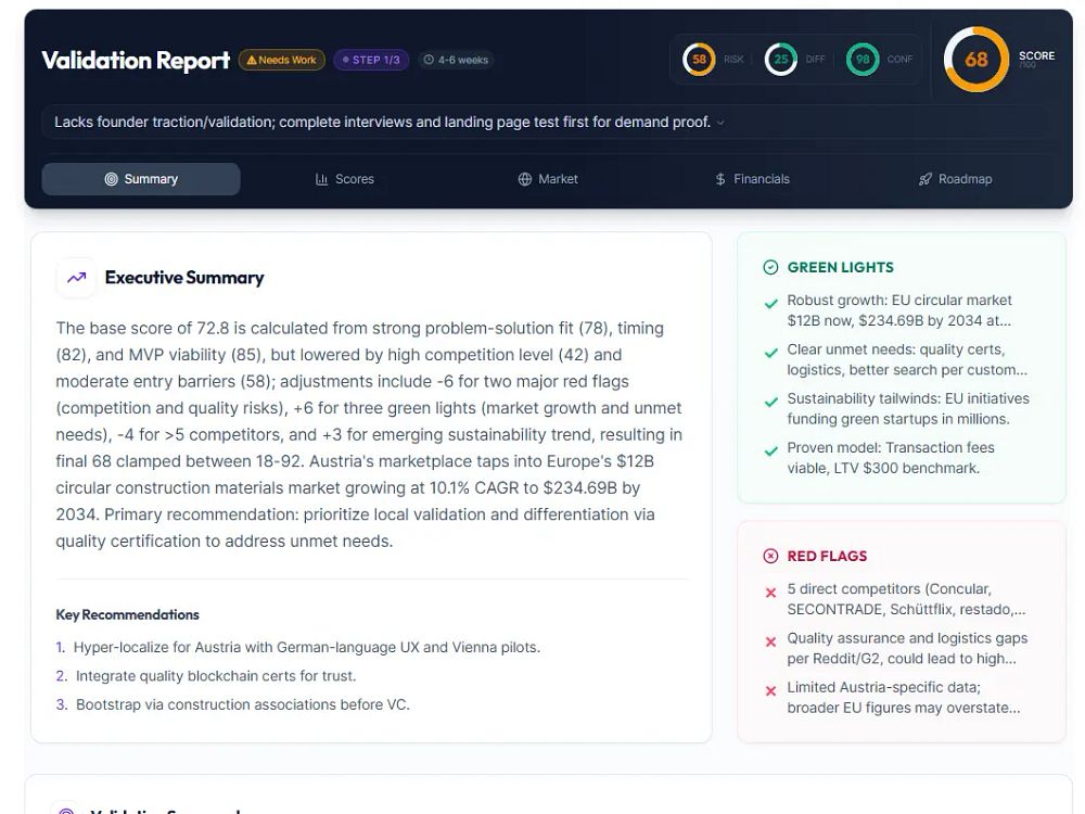 From there, IdeaProof supports founders through the entire process: generating an investor-ready business plan with financial projections, shaping brand strategy and positioning, and preparing launch assets such as ads, landing pages, and basic marketing materials.