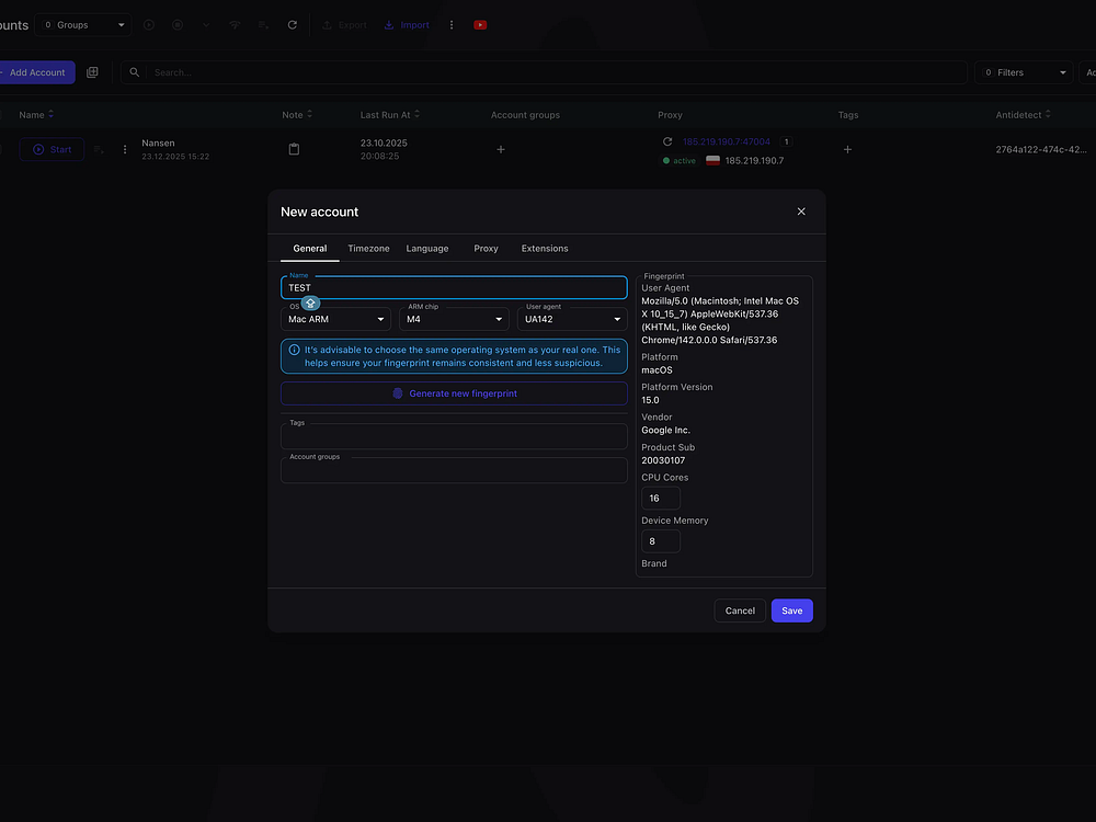 Afina is a Chromium-based antidetect browser designed for real-world environments where fingerprint consistency and network behavior are crucial. It utilizes a genuine browser network stack with native support for WebRTC and QUIC (HTTP/3), ensuring traffic patterns and connection behaviors resemble those of real users.