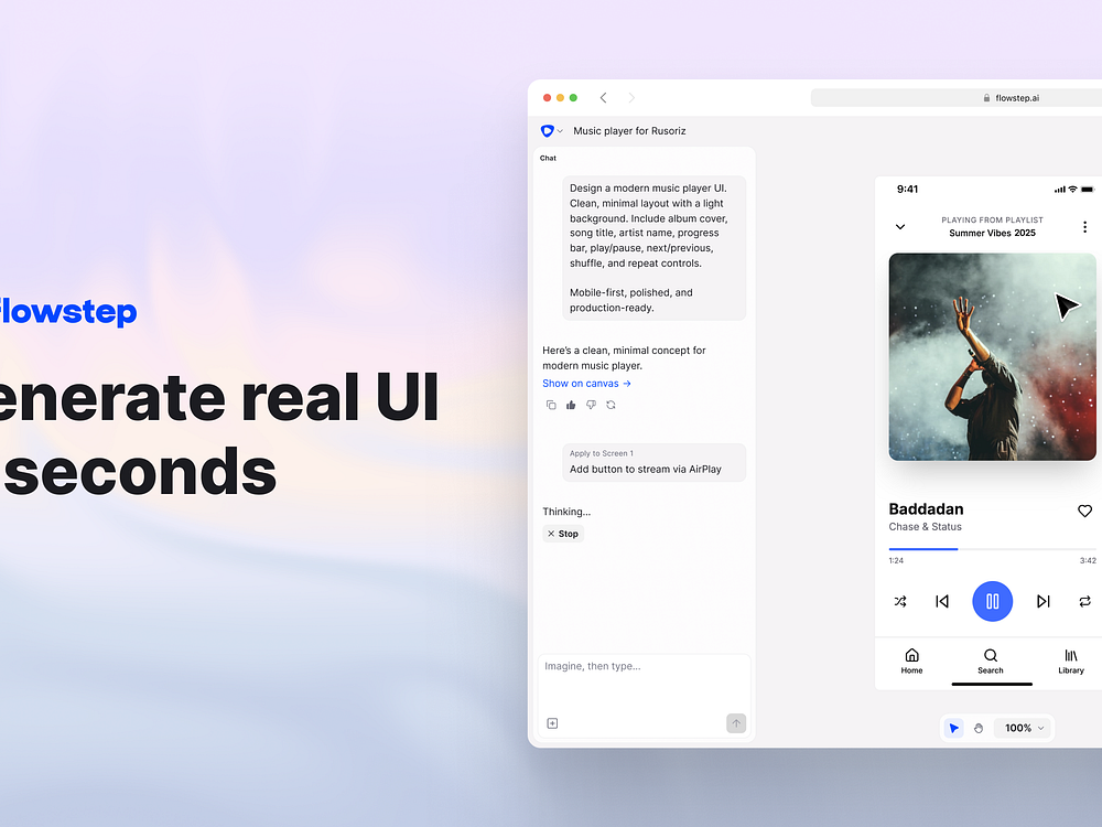 Flowstep generates editable UI designs in seconds. Describe what you want, design on an infinite canvas, edit with AI or manually, and copy results straight into Figma. Create multiple screens at once, add visual references, and collaborate in real time. Export clean, production-ready React, TypeScript, and Tailwind CSS code so engineers can use it immediately.
