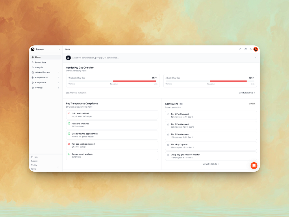 Evenpay provides compensation intelligence that transforms your HR, payroll, performance, and job data into fair and defensible pay decisions. It builds a transparent job architecture, runs structured compensation reviews, and generates full EU Pay Transparency Directive reports. With an AI-powered Compensation Specialist, real-time pay-gap alerts, and objective pay justification workflows, Evenpay helps HR and managers identify, explain, and resolve inequities before they affect compliance or culture. Evenpay is the most efficient way to establish a compliant, fair, and data-driven pay structure.