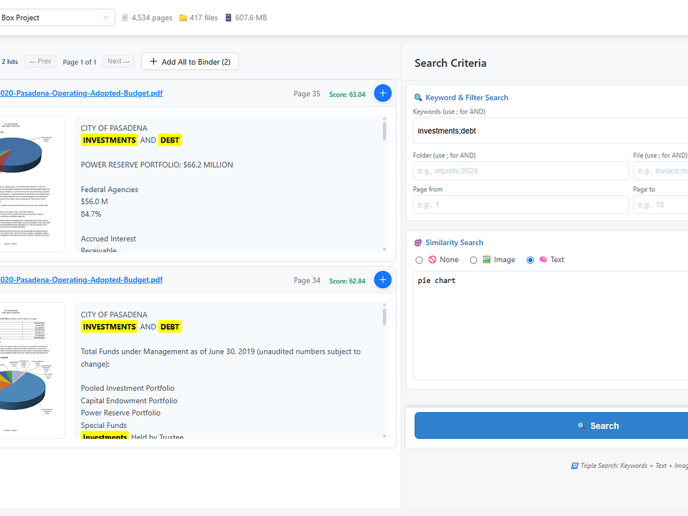 PageFinder is an AI-powered document search platform that allows you to find exact pages, text, and visuals across your files in seconds. It indexes documents at the page level and supports various formats, including PDFs, docs, spreadsheets, presentations, and images. With features like keyword, image, and text-to-image search, you can ask questions using AI chat, create shareable binders, and transform your document library into an interactive knowledge base.