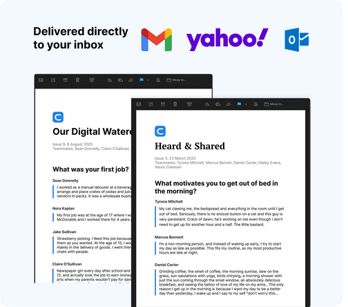 CONNETY is a private internal newsletter for teams. It sends teammates a small number of personal (non-work) questions on a regular basis, collects their answers, and publishes them as a shared team newsletter that everyone can read. The process runs fully on autopilot. CONNETY has a curated bank of approximately 600 questions across 10 categories and 3 reflection levels. It adds a lightweight relationship layer on top of existing work tools, helping teammates build personal context over time to support engagement, collaboration, and retention without meetings or facilitation.