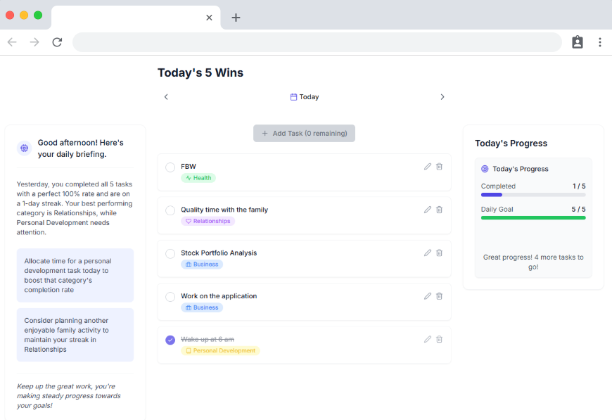 FocusUp is a mindful productivity app designed to end the cycle of overwhelming to-do lists by focusing on just five meaningful wins each day. By shifting the focus from "doing everything" to "doing what matters," the platform helps users achieve a sustainable balance across three core pillars: Body, Mind, and Wealth.